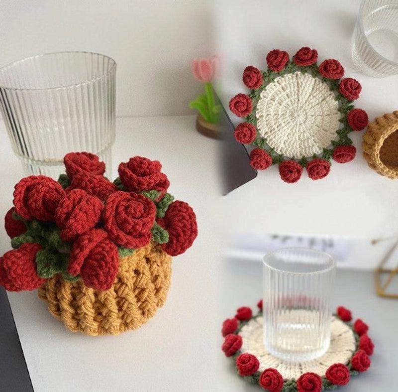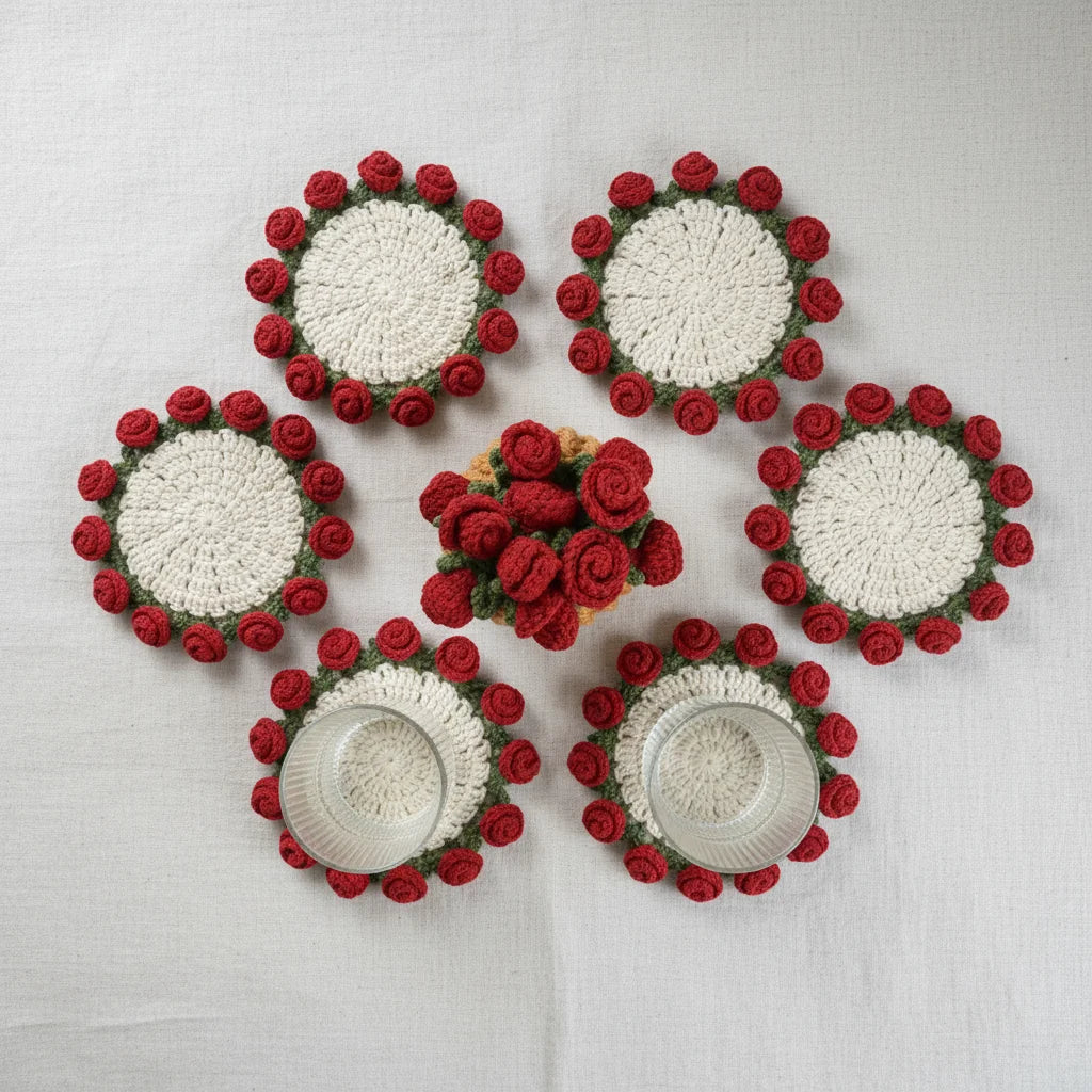 Adorn your surfaces with delightful crimson roses and verdant leaves, crocheted with such care, they seem to bloom right before your eyes, adding a charming accent.